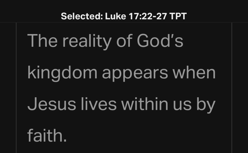 ”The kingdom is not discovered in one place or another, for God’s kingdom realm is already expanding within some of you.”“