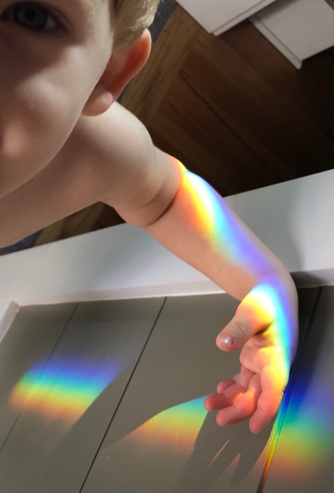 An isolated patch of moonlight shone on the floor at the foot of my bed. I’m up at all hours of the night and I had never seen this spot before so I stepped across it, searching for its origin. A full moon was just a day or two away. There were no clouds in the night sky but the moon was not yet visible over the lake, and the angles were all wrong for our westward facing windows. I glanced upward as I stepped into the bathroom and there it was in the transom window above the shower, a brilliant moon. I turned to look at the spot of moonlight on the floor and my shadow now obscured most of it. That’s when I remembered Thomas’s rainbow in this very spot. The sun shining through this same window and the shower door refracted the light perfectly to display a rainbow on the floor. As the earth shifted in its course around the sun, the rainbow had crept slowly up the wall and disappeared from sight. As I slipped back into bed, something occurred to me. God on display in my life should make people look for the Source of the Light. My job is to make sure they know it isn’t me!