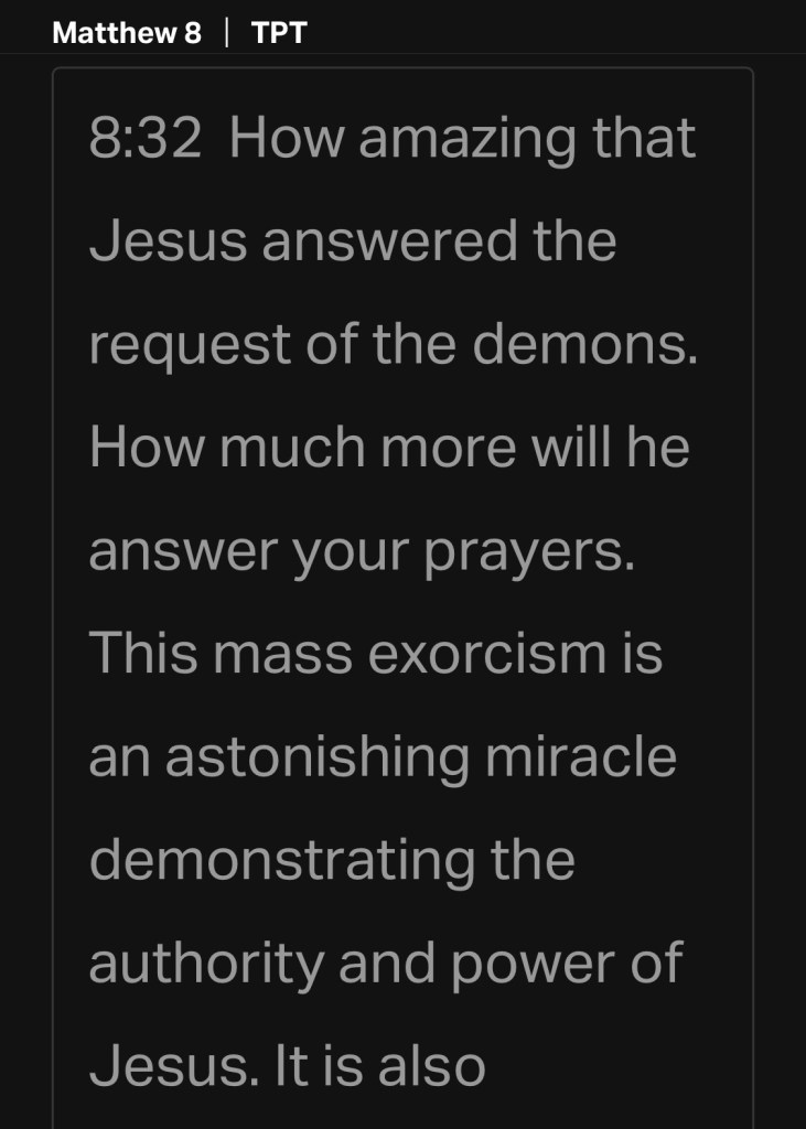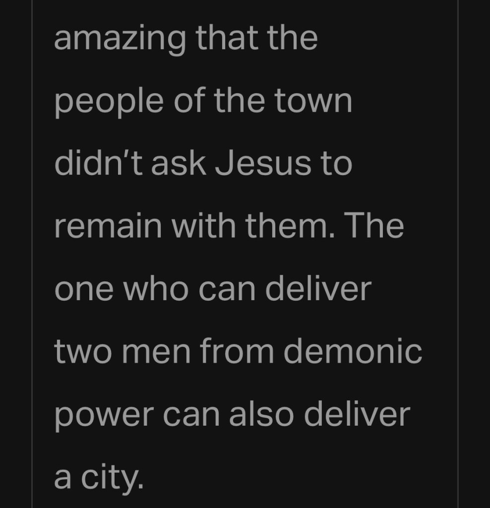 How did the men come to be in this demon-possessed state? We aren’t given their backstory. We’re only told that Jesus commissioned them as missionaries rather than inviting them to follow Him. They would be living, breathing, walking testimonies* of God’s goodness and grace where Jesus was not welcomed. They received this commission before the advent of the Holy Spirit, but I would love to know how it felt for them when the Spirit of God fell, when God’s perfect presence came to dwell in clay jars that once held deepest darkness and now radiated pure Light!