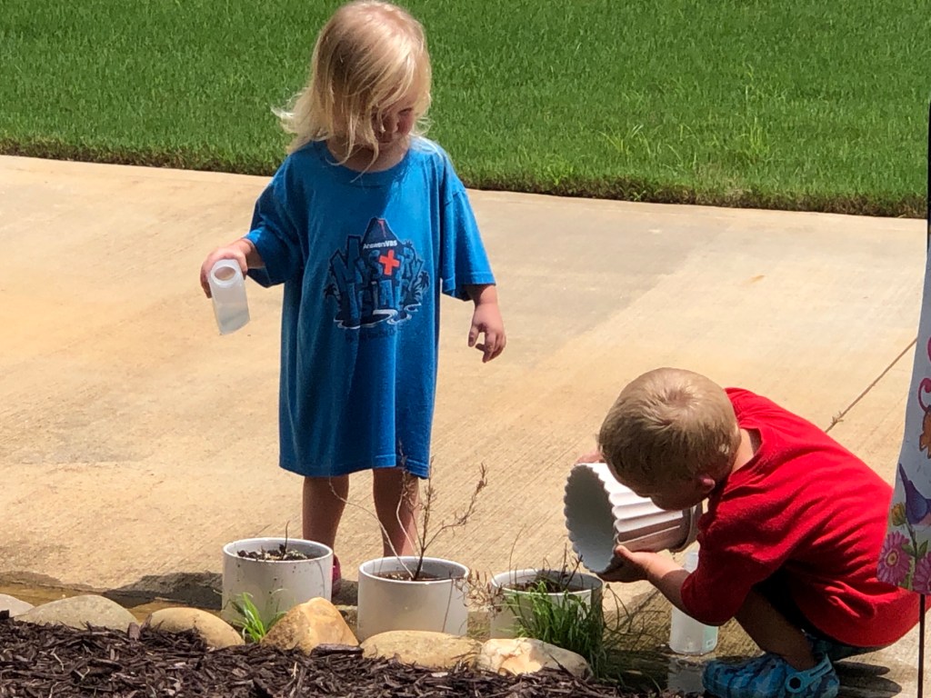 Thomas and Amelia are not deterred. They see me watering the basil inside and hear me commenting when it perks up, so today while playing water table outside to stay cool and calm, they decided to attempt to resurrect the rosemary, mint, and thyme. Using my words, Thomas explained to Amelia how giving them a drink of water would bring them back. That would be more than curious at their current state of crispness, but stranger things have happened. If over-saturation and pure determination are the answer, then I’ll be expecting green sprouts any day now.