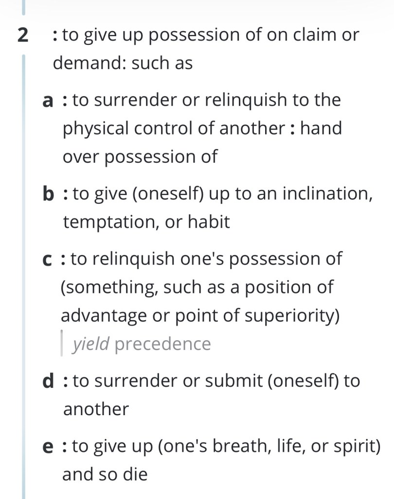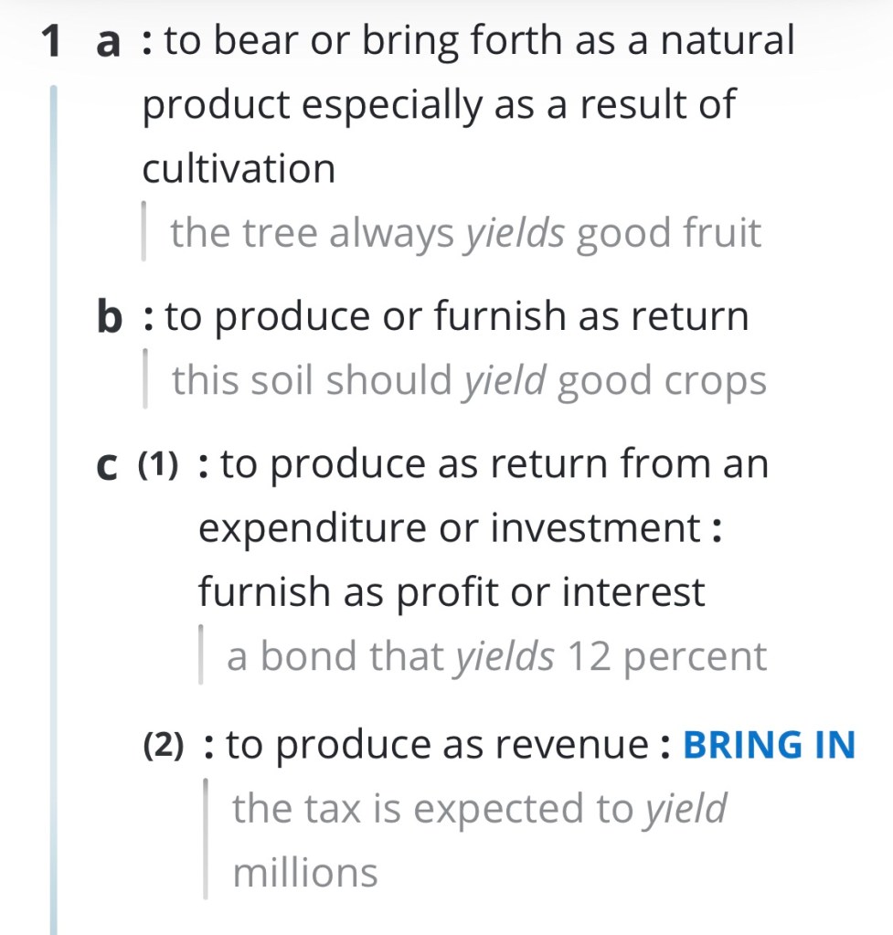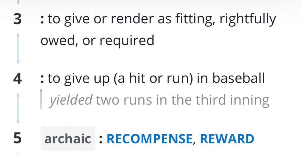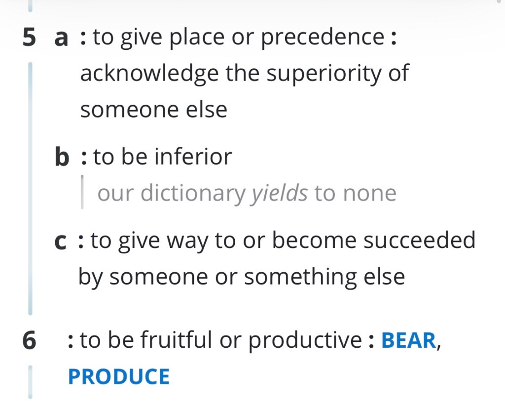 Yield is not a widely used word outside of traffic circles and investments, but consider one last time the implications of yielding our hearts to God. Glance over the definitions and let the Spirit shed light on God’s Word. (My comments will follow but take a moment and see for yourself how God speaks clearly and directly to those who seek Him with their whole hearts.)