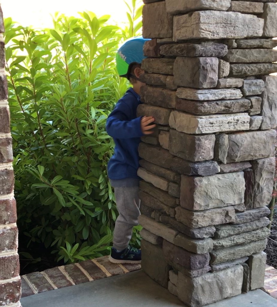 “Want to play hide and seek, Thomas?” asked Amelia as she propped her forehead on her hands against the stone column on the front porch. “Yes,” he answered, striding over to take her exact posture on the opposite side of the same column as she began to count. The moms and I looked at each other and grinned. One day they’ll get it and we’ll remind them of their early attempts, but for now, they’ll entertain one another with a toddler’s version of peekaboo around a stone column amid peels of laughter.