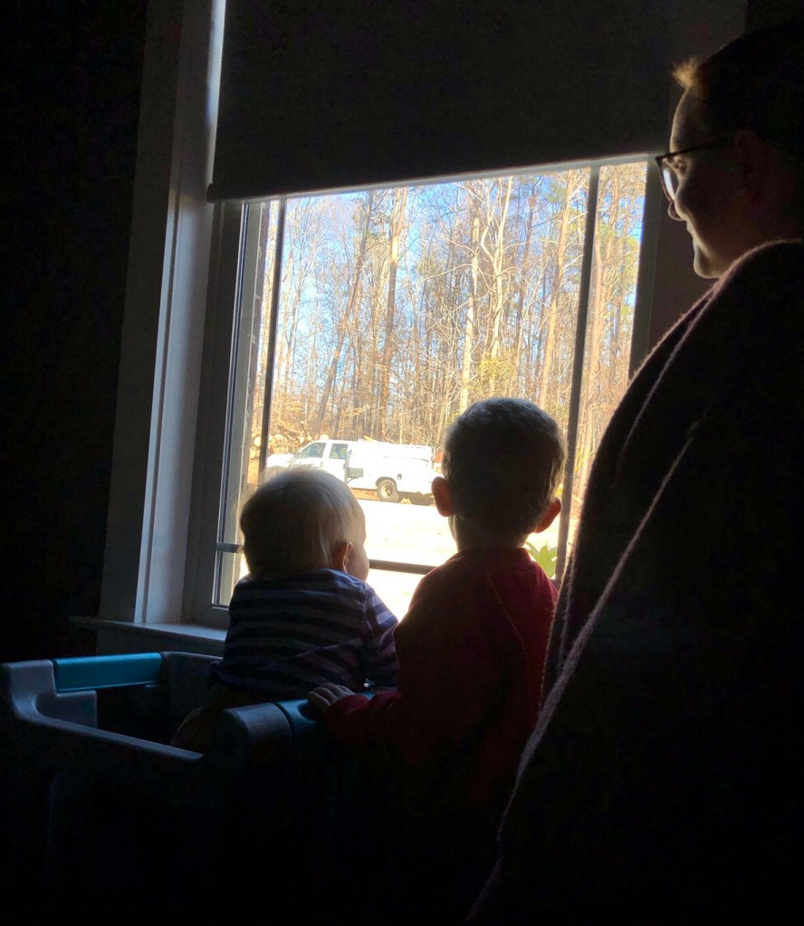 I put my phone down and opened the safety gate to walk toward the window alcove. Loud knocking on the glass pane preceded Amelia’s mommy voice. “Stop doing that, Thomas!” His mom has been teaching him lately that when it comes down to listening to an adult or Amelia, he should listen to the adult. This time I had to agree with Amelia. We’ve all told him repeatedly not to bang on glass for obvious reasons. He drums on anything and everything but today, as he watched the ongoing tree work across the street, he simply wanted the attention of his buddies in the earth movers. I could have chimed in with Amelia. Instead I said, “They’re working too far away on machines that make far too much noise for them to hear you knocking. And I don’t want your hands to get hurt if the glass breaks. Wait until Poppy comes home and they’re done working. Then you can go say hello.”