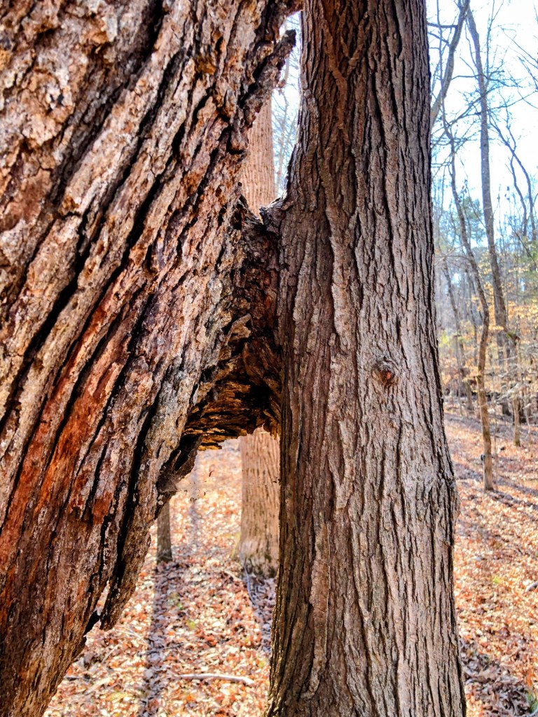 Some spaces are more visible now with sunlight rushing in where canopy once filtered the light. Near the head of the trail, two trees intertwine, both hardwoods but whether the same or differing species, I do not know. Their bases are adjacent but distinct. The smaller wraps it’s branches around the larger as if slow dancing. The tops of both reach far above the surrounding treetops. I’m amazed that the smaller was never choked out by the larger but they not only coexist, they thrive together. In places, it is difficult to tell where one starts and the other ends. I am reminded of God’s intention for marriage each time I pass this tree.
