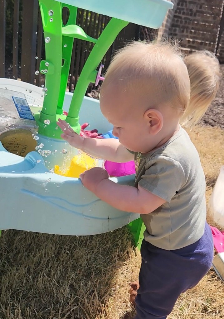 Today was sunny and warm so my daughter added an inch or two of water to the trough. Amelia was standing by ready to play. I brought Ezra from his swing, meaning to stand him next to the water station but he had other ideas. He stuck his little legs straight out, fully intent on sitting in the water as he does for a bath. I touched his toes to the ground and placed one of his little hands on the side of the table. Before I could back away, he was splashing vigorously. In his excitement, we both got soaked!