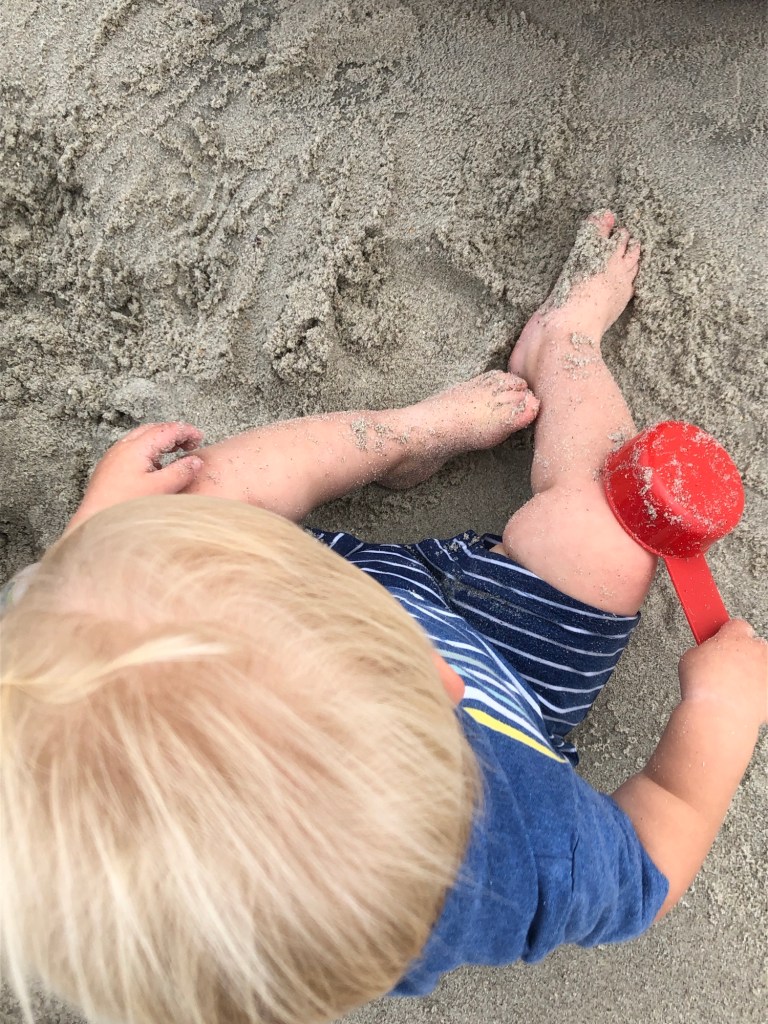 Timothy wasn’t walking the last time we were at the beach so when we arrived at the ocean yesterday and removed his little shoes and set him on the soft sand, he sensed the shifting and immediately reached up to his momma to be held. Thinking the water would draw him in, she dangled his little toes into the tide pool and set him down again on the edge where his feet immediately began to sink into the wet sand. It took several more tries for him to realize the ground wasn’t actually moving but finally he plopped down and began scooping up wet sand, watching as it sifted through his chubby little fingers. Before long he was up and waddling away from the water’s edge chasing a runaway bocce ball.