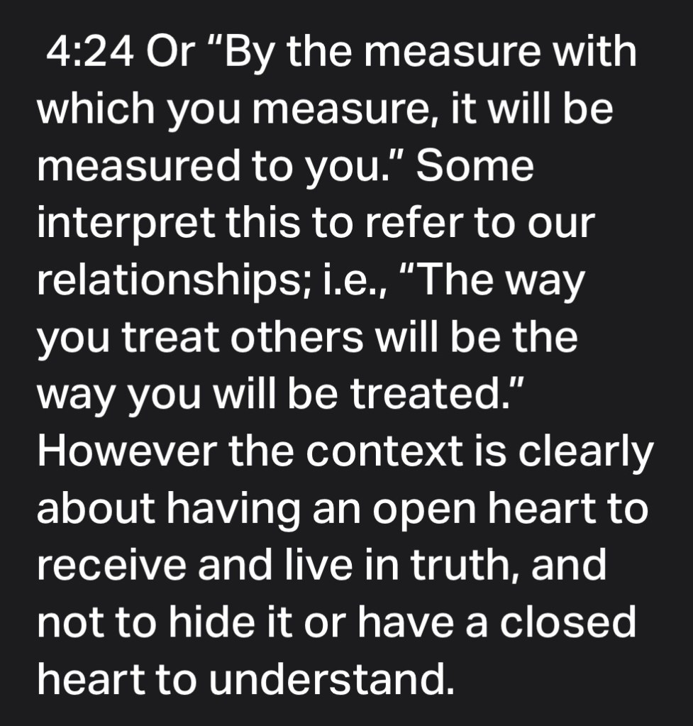 The give and take Jesus spoke of is spiritual truth. Jesus used nearly the same phrase according to Matthew with his disciples following the parables of the seed and the sower and the three servants. (Matthew 13 & 25) With the phrase, “whoever has ears let him hear,” Jesus is calling the apostles to listen like James instructed. He’s challenging them to use it or lose it.
