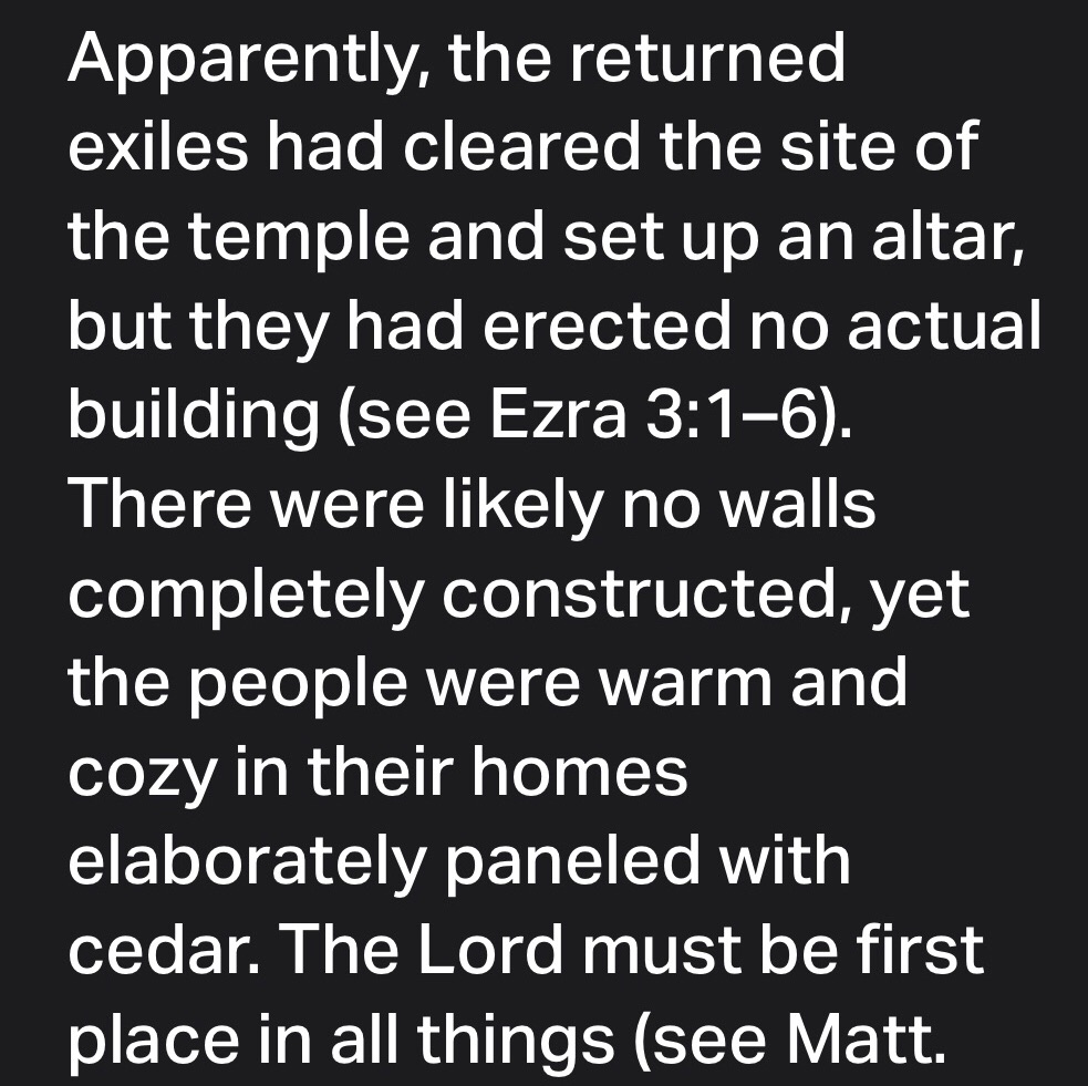 Because my house lies in ruins, says the Lord of Heaven’s Armies, while all of you are busy building your own fine houses.”