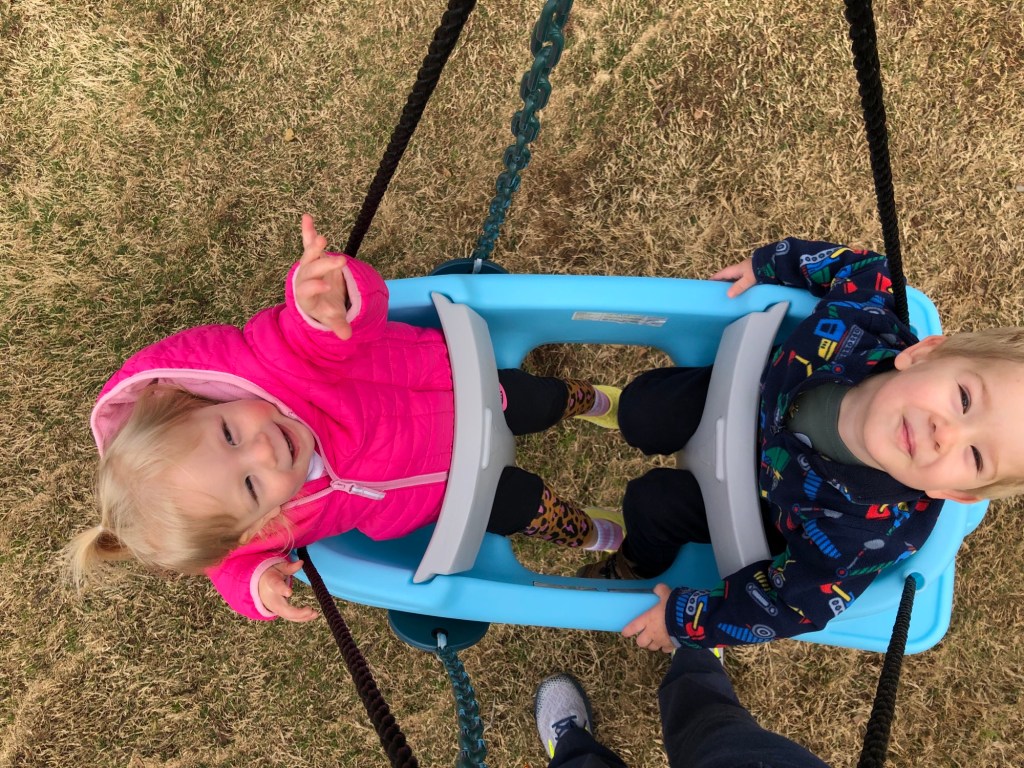 After I talked through the verses with them, I asked, “Are you done swinging?” “No!” came their unanimous reply. “You’re in the same swing. You’re both a little sleepy but you were swinging together so nicely before. Thomas, Amelia asked you not to bounce anymore please. If swinging is making you sleepy, you’re welcomed to get out and play something else.” In the end, Thomas wanted to be with Amelia more than he wanted to have his own way. The next moment, the frenzy was joyous and Lolly was sneaking kisses and tickling toes as the swings flew back and forth.