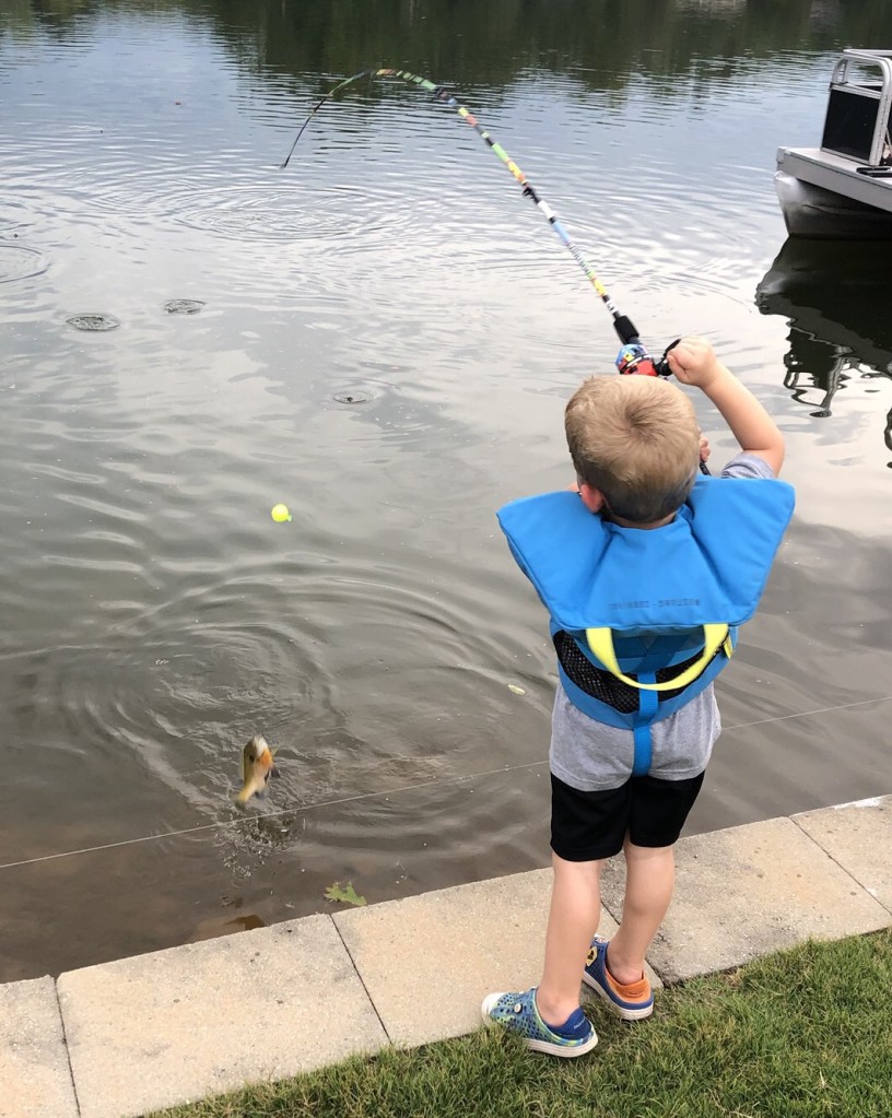 Thomas hurriedly ate his dinner and began what my daddy calls “chomping at the bit” before my husband had filled his plate or tasted his first bite. He’d been waiting all afternoon for Poppy to get home to take him fishing. Now he half paced, half bounded around the kitchen table, before announcing, “All right, everybody. It’s time for fishing!”