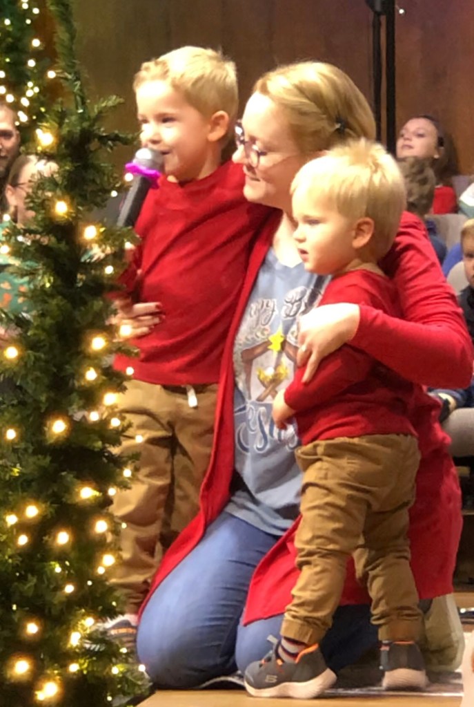 Thomas sang out the message of the angels loud and clear, one arm around his mama’s neck, fingers fiddling in her hair. Timothy perched on our daughter’s knee, smiling and waving happily. Poppy and I watched with their dad from the aisle near the front and I’m sure all heaven was rejoicing. I know I was!